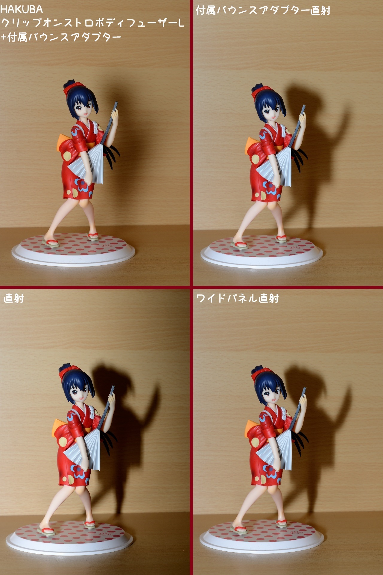 バウンスアダプターを直射した場合でも、何も付けず直射した場合よりは影が薄くなっていますが、ディフューザー+バウンスアダプターの影を和らげる効果は他に大差をつけています。